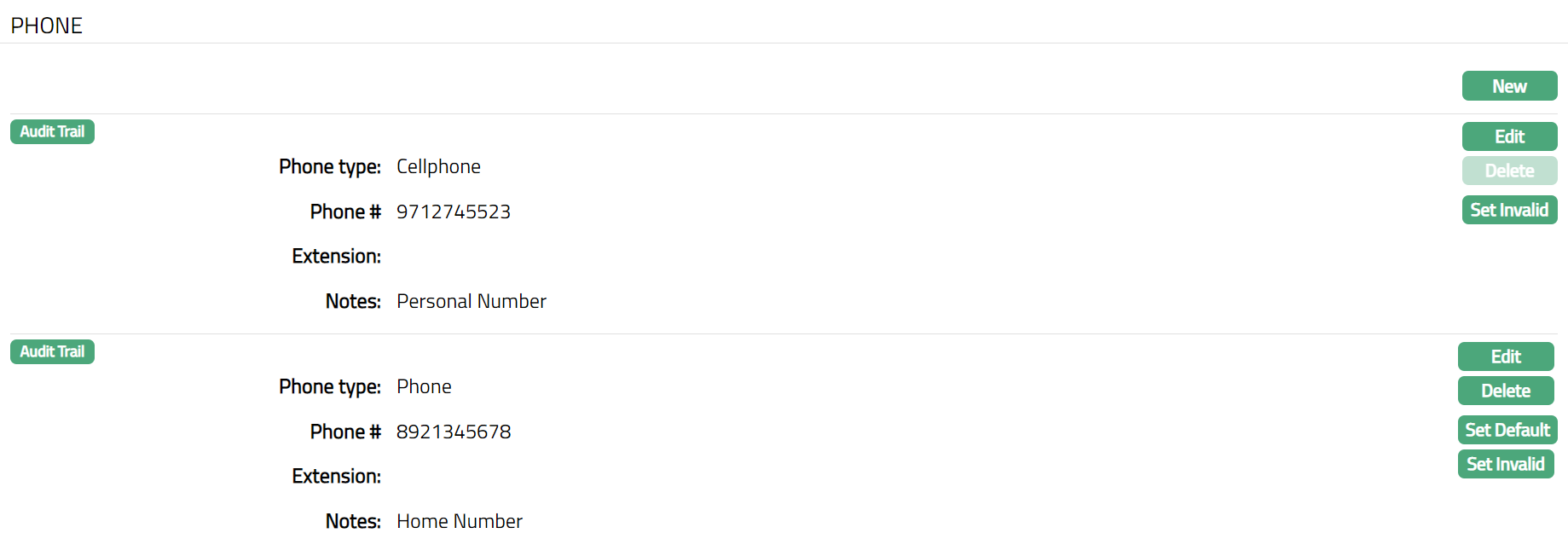 Set Default: When you create multiple Phone records, you can set one of them as the default Address using the Set Default function. When there is only one Phone detail, the same is taken as the default Address.