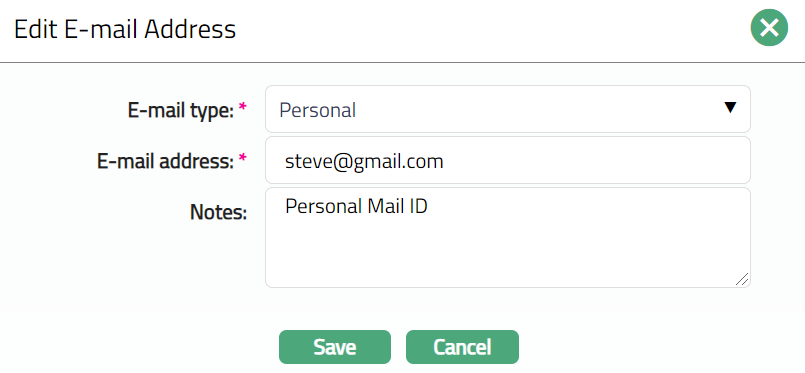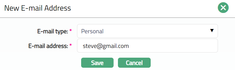 Select E-mail type from the available drop-down list maintained under Admin > System Codes > Address details > E-mail types.
