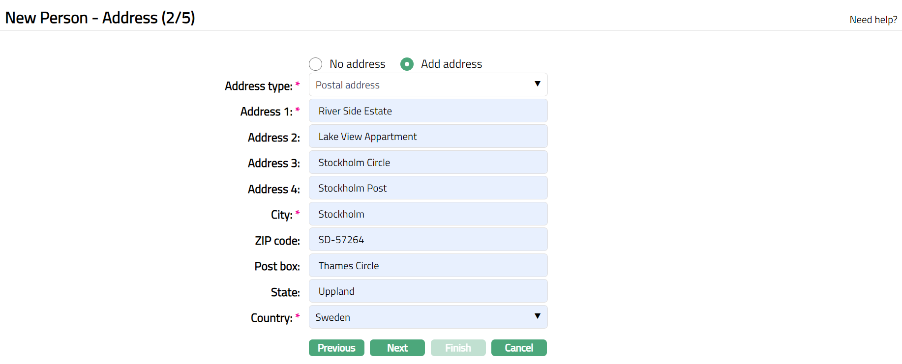 Click Next. New Person -- Address (2/5) page appears.