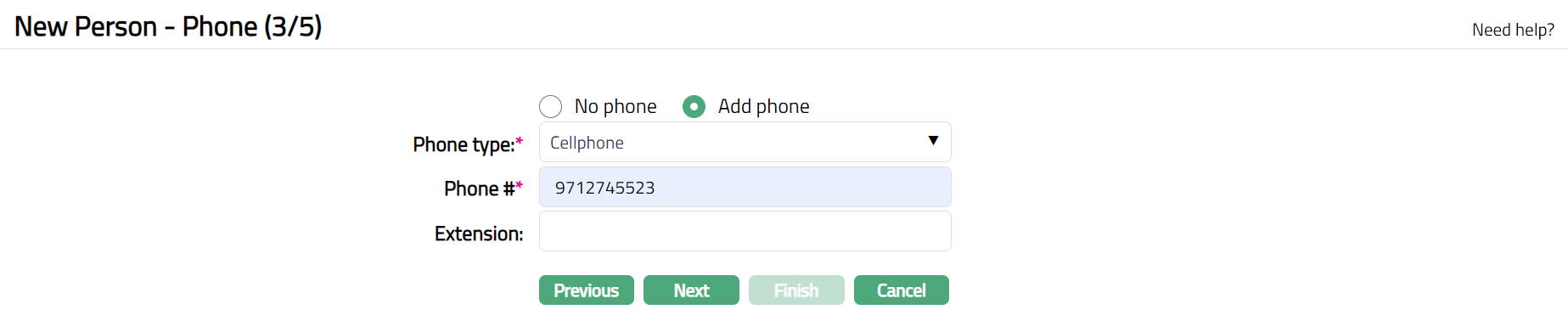 Click Next. New Person -- Phone (3/5) page appears.