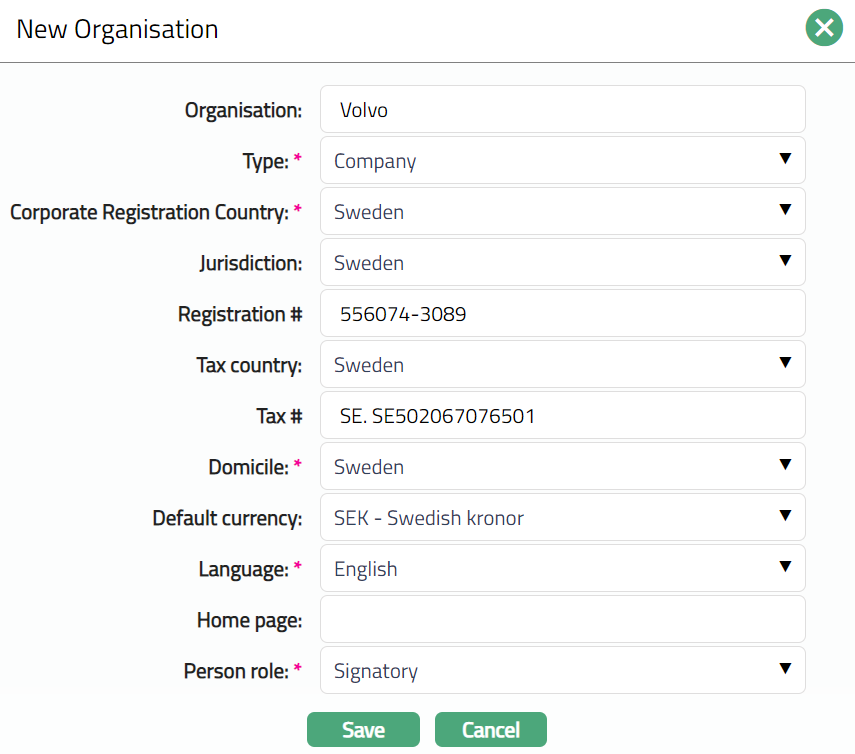 Select Tax country from the drop-down list countries maintained at Admin > System Code > Generic definition > Country. It is the country where the Person does employment / business and files tax to the government.