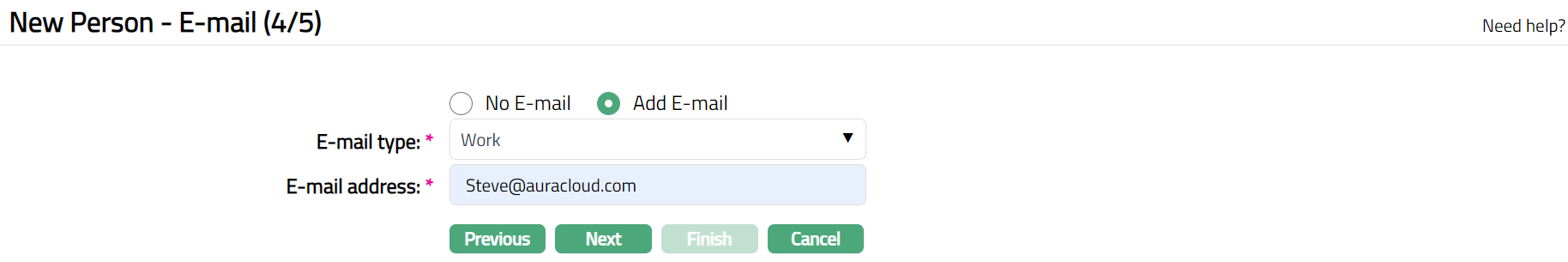Click Next. New Person -- E-mail (4/5) page appears.