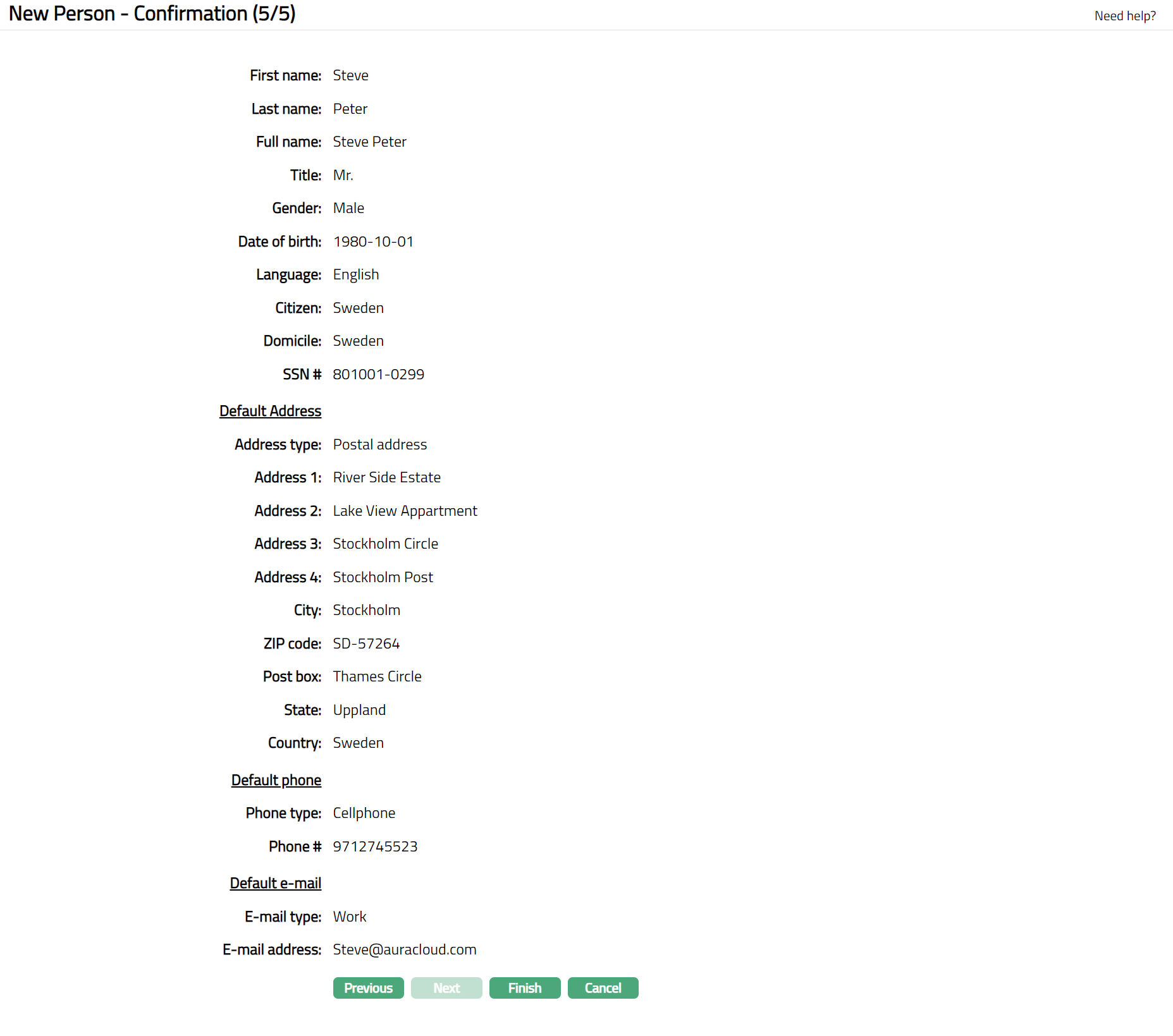 Click Next. New Person -- Confirmation (5/5) page appears showing all the details that you entered for the person.
