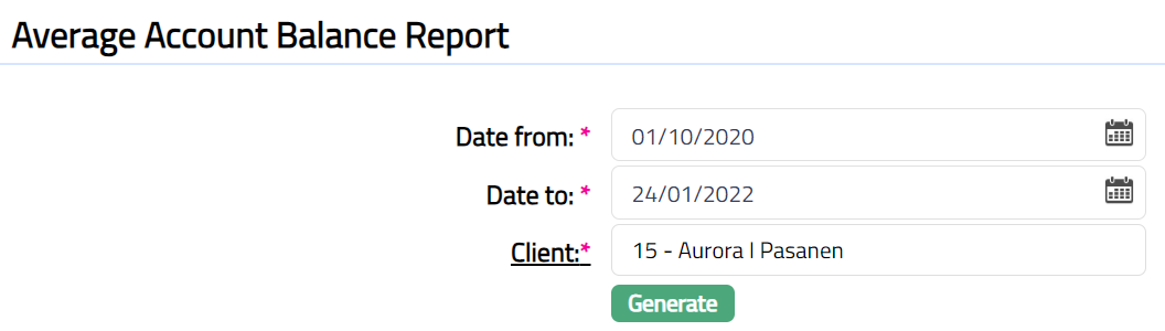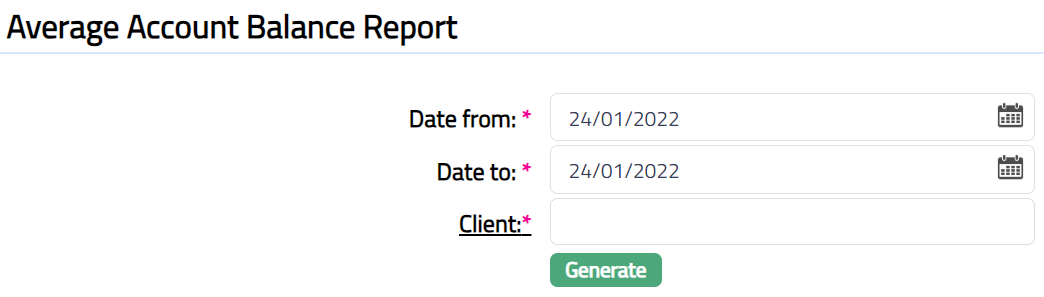Average Account Balance tab allows you to generate account balance report for a specific period of the selected client.
