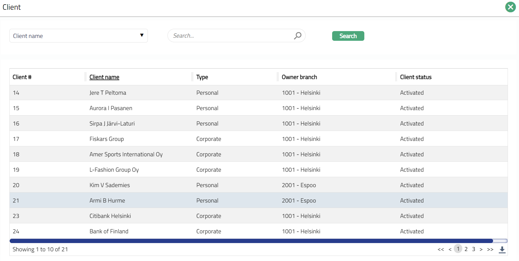Select Client by clicking client hyperlink. Client search page appears where you can search for a client with relevant criteria and select the required client. You can also input the client name and select the required client from the list displayed by Aura. Based on criteria, Aura will display the list of all the clients maintained under CRM > Client > Maintain.