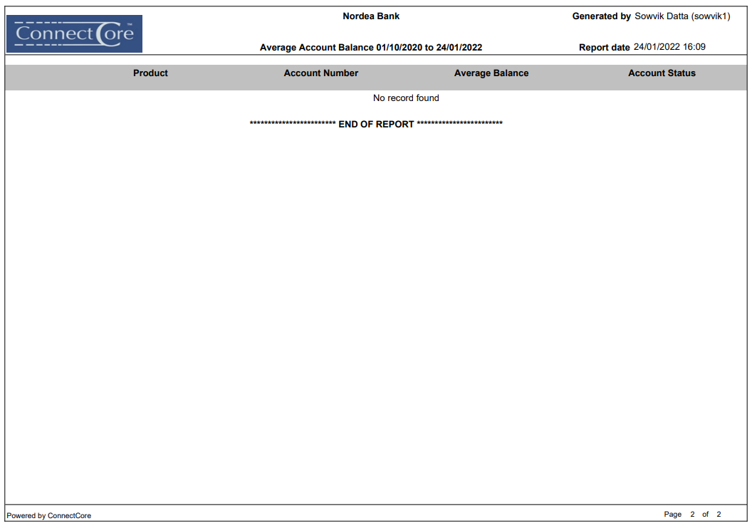 Access CRM menu, click Reports and then Average Account Balance. Average Account Balance Report page appears.