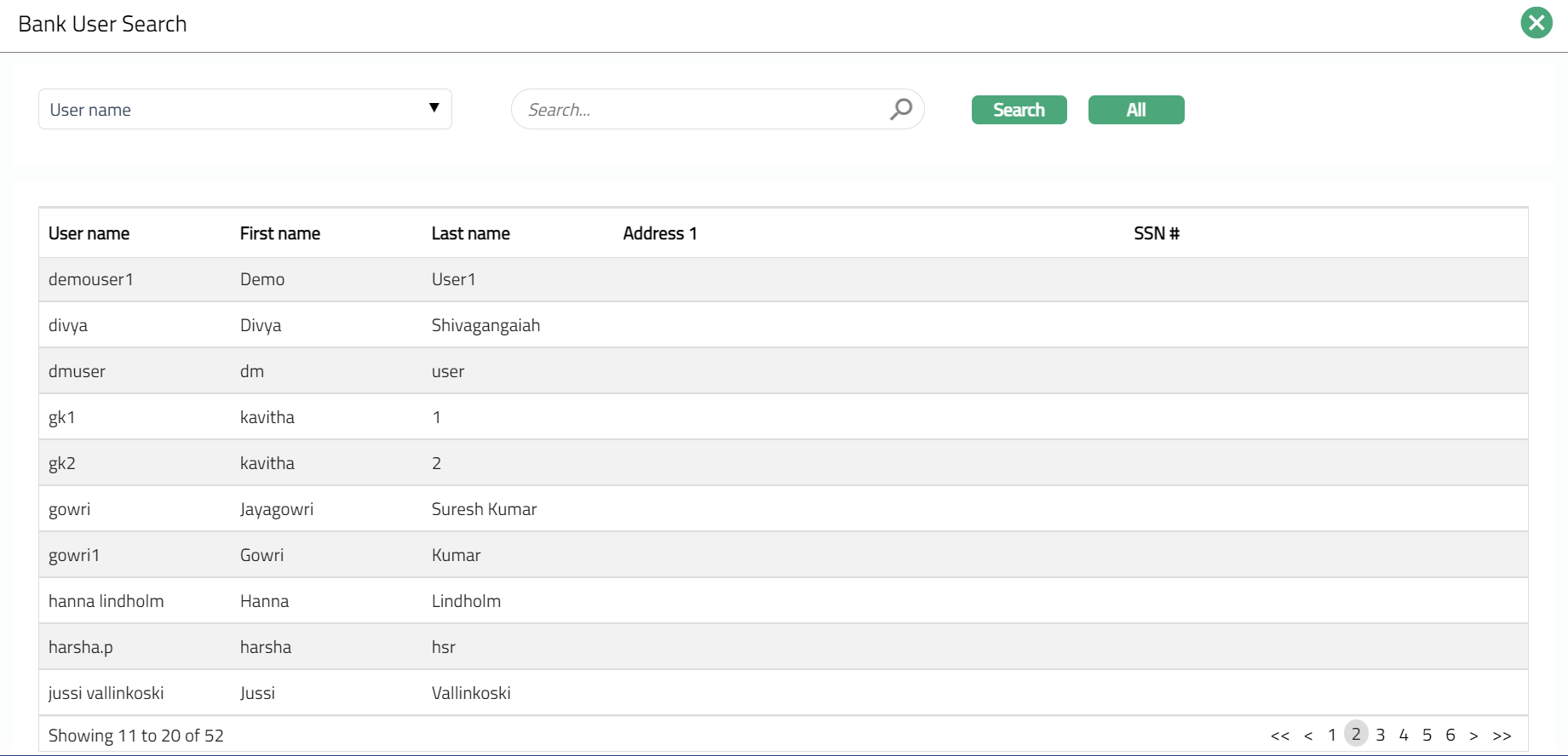 - Select Agent user who will be reporting to the Bank by clicking Report to (Bank) hyperlink. Report to (Bank) search page appears where you can search for a Bank (Aura) user with relevant criteria and select the required User.