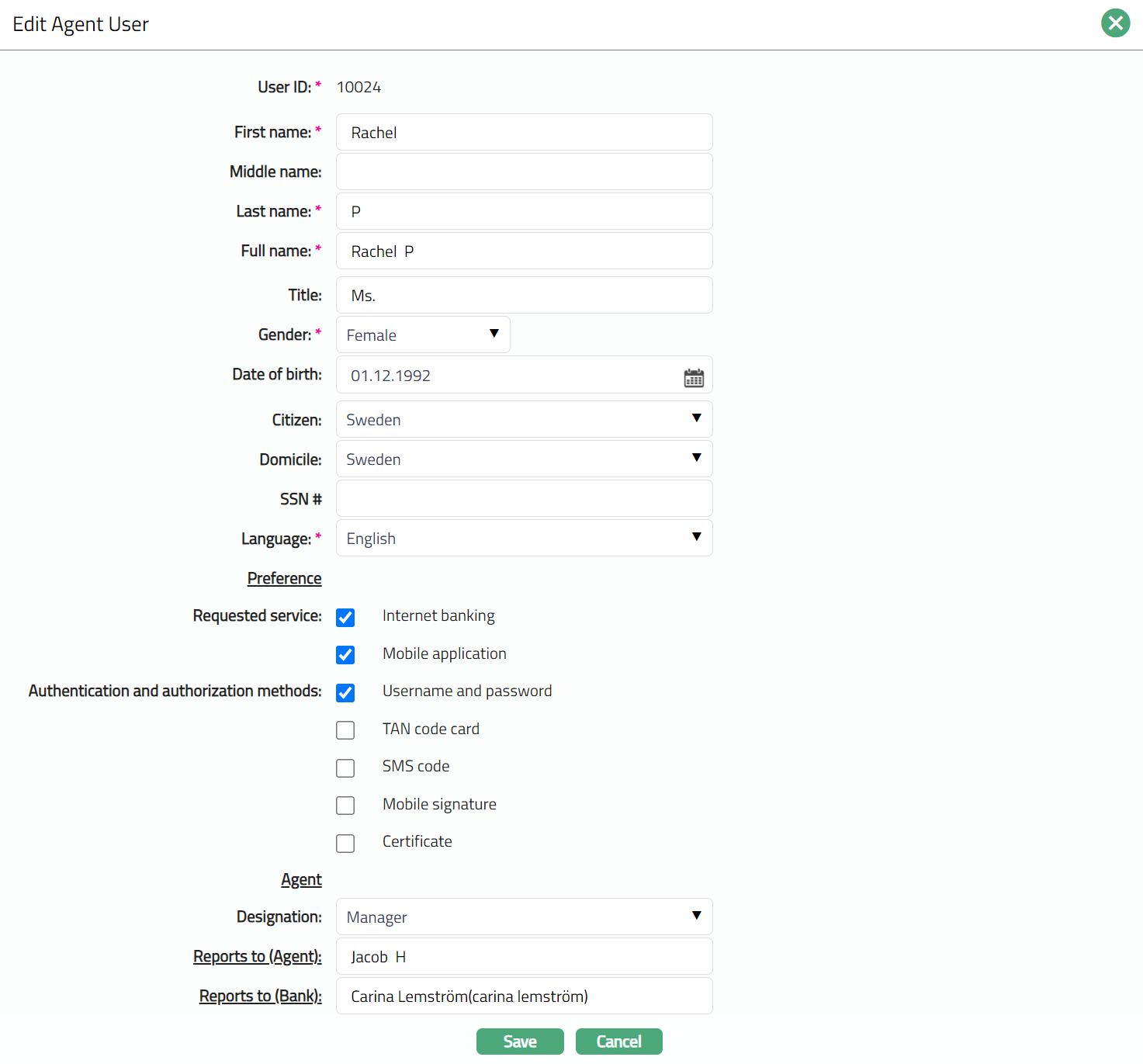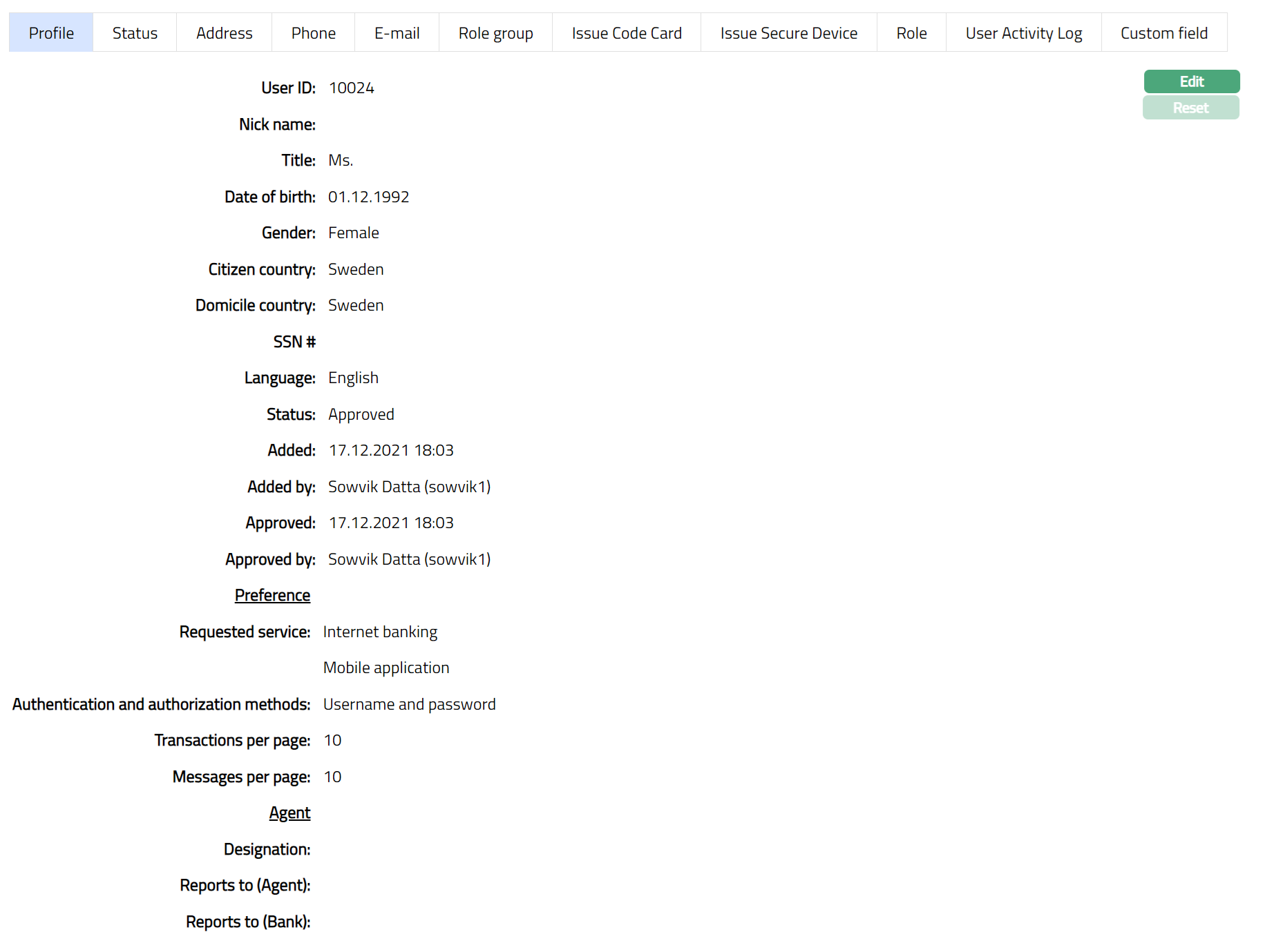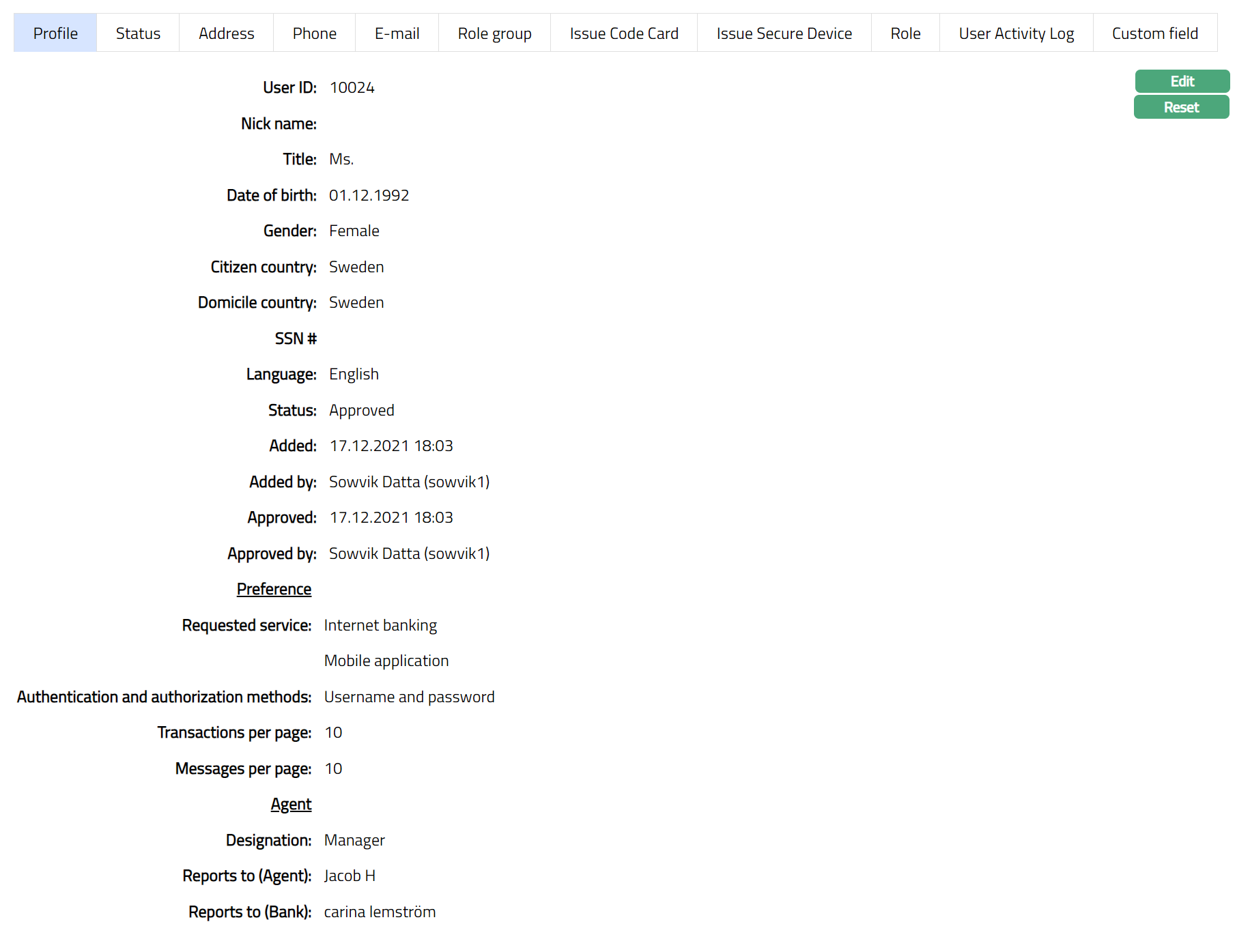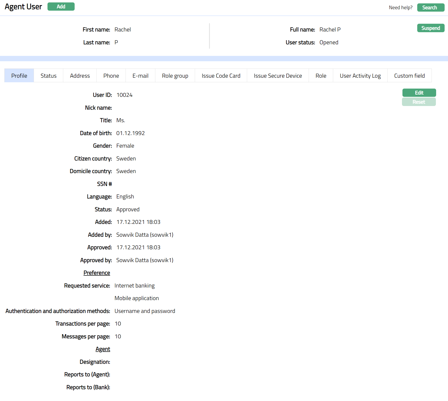 Profile tab, which is the default tab in the Agent Maintenance screen, shows the basic details of the Agent User. It is also used to reset the password of a user.