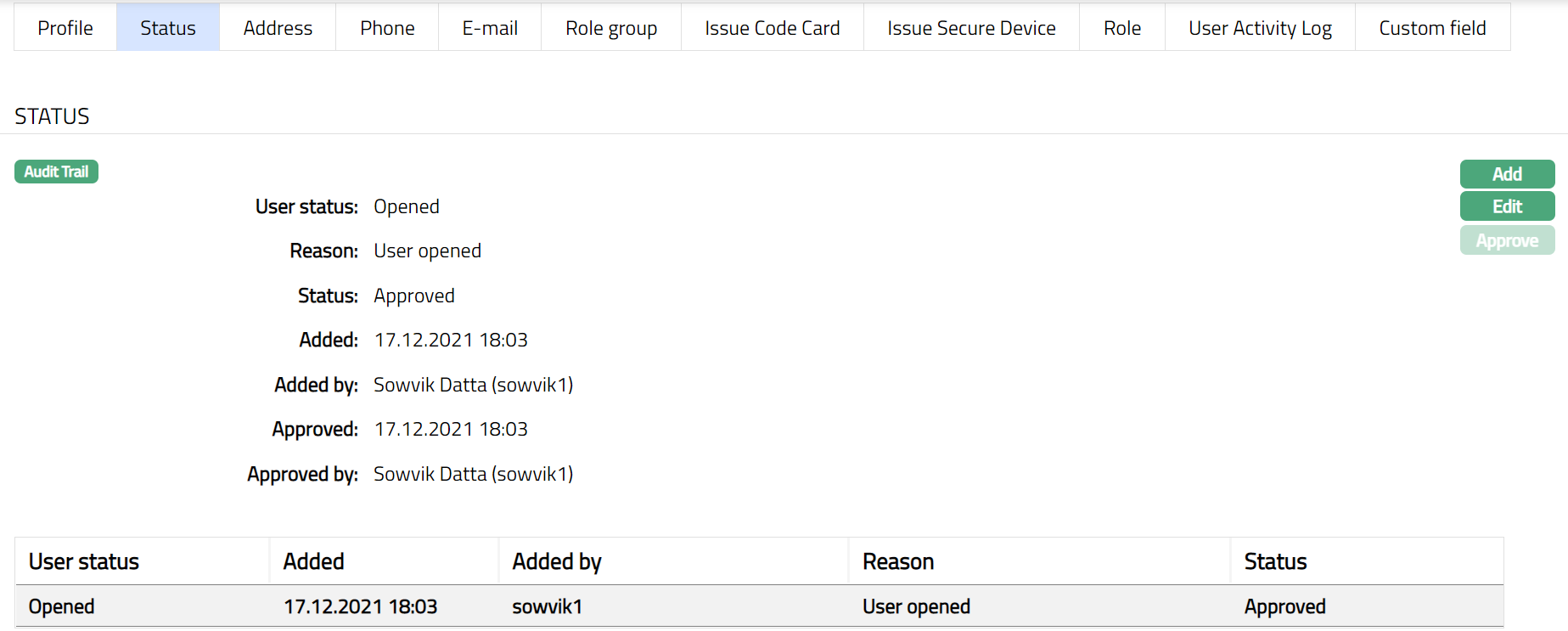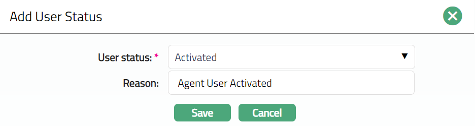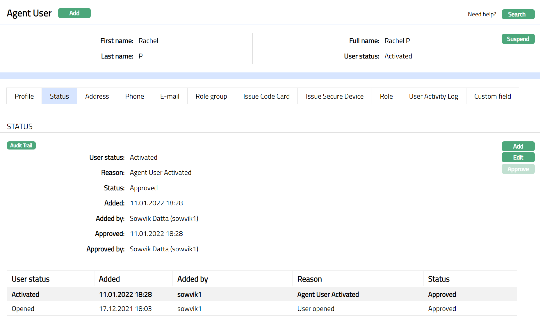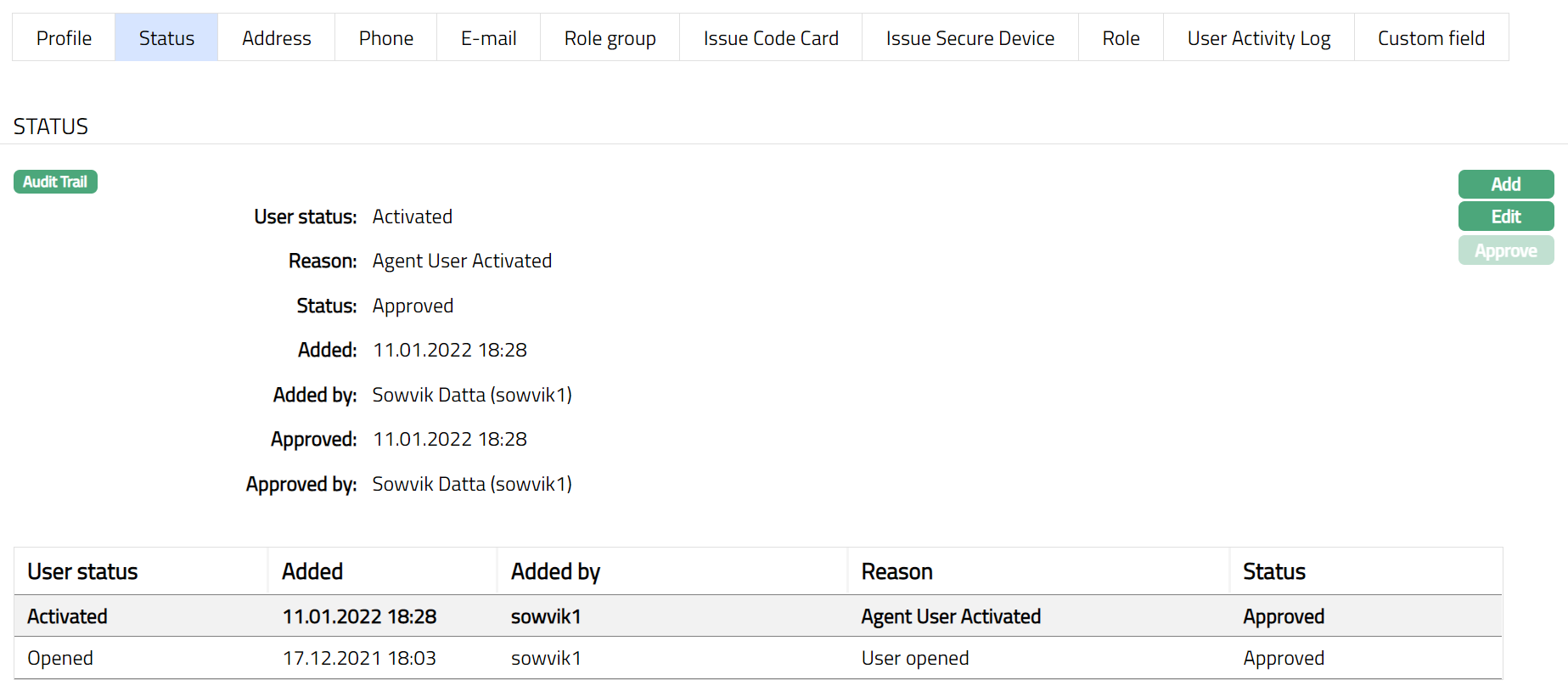 Using the Status tab, you can add and view the history of the Agent User status, as well as approve the status records. On creating an Agent User, the status is Opened.