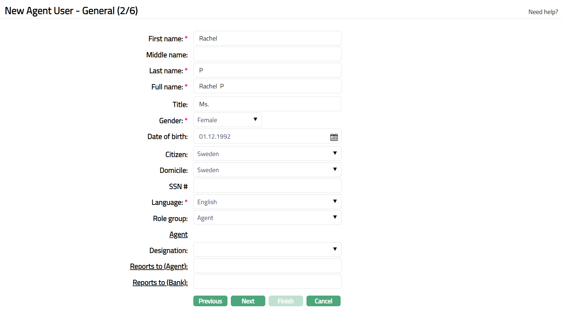 Input Date of birth of the user. You can either enter the date manually or select using the calendar. Aura will validate the date format against the format maintained under Admin > Entities > Maintain > Regional > Date format.