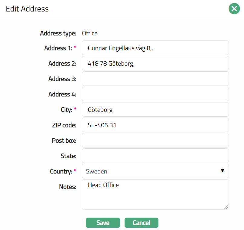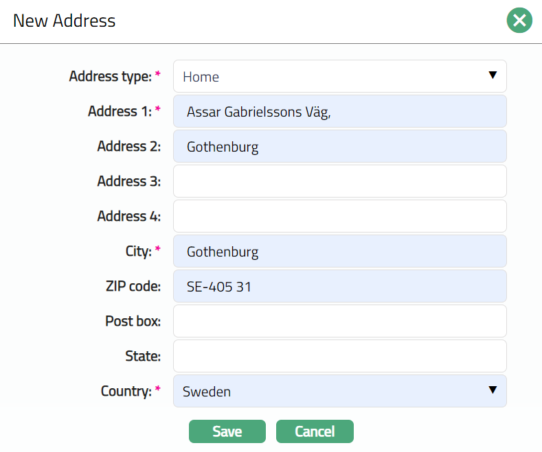 Select Address type from the list of Address types maintained under Admin > System codes > Address Details > Address types.