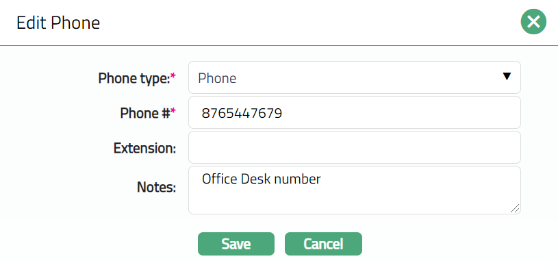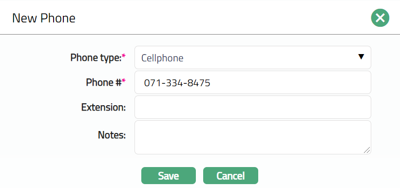Select Phone type from the drop-down list maintained under Admin > System Codes > Address details > Phone types.