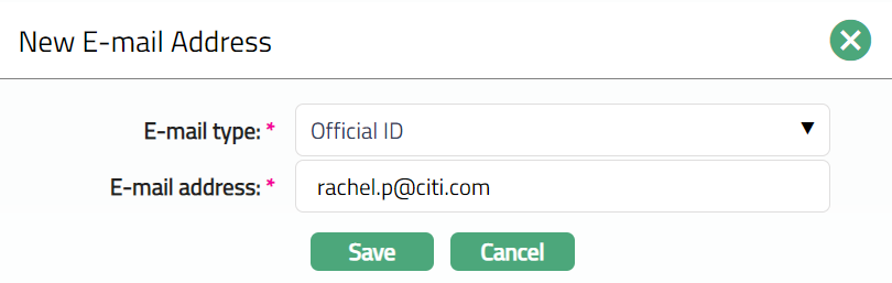 Select E-mail type from the drop-down list maintained under Admin > System Codes > Address details > E-mail types.