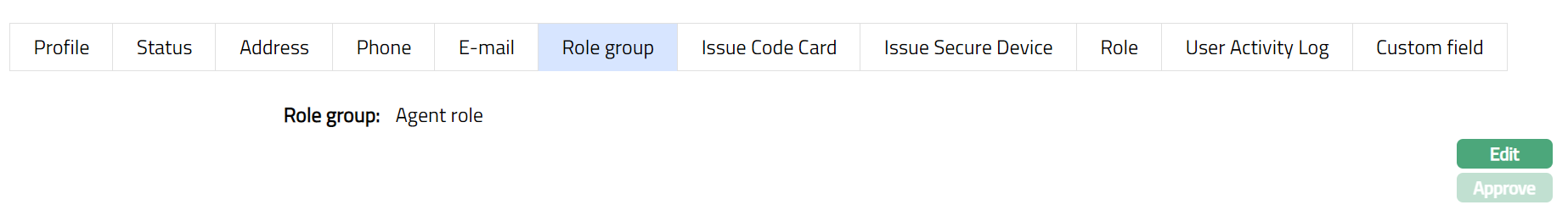 - Access Agent User Maintain page and click Role Group tab. The details are defaulted from the entries that you made during creation of Role Group under Admin > User > Role Group