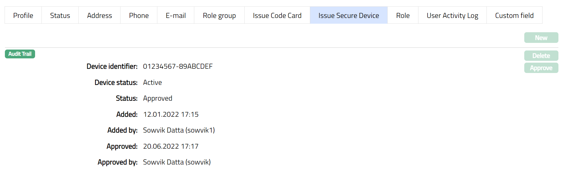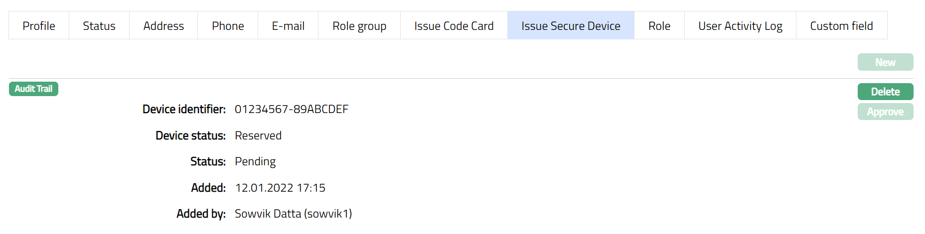 Any person other than the one who assigned the device can approve the issued Secure Device. Once the Secure Device is approved, the Device Status will change to Active.