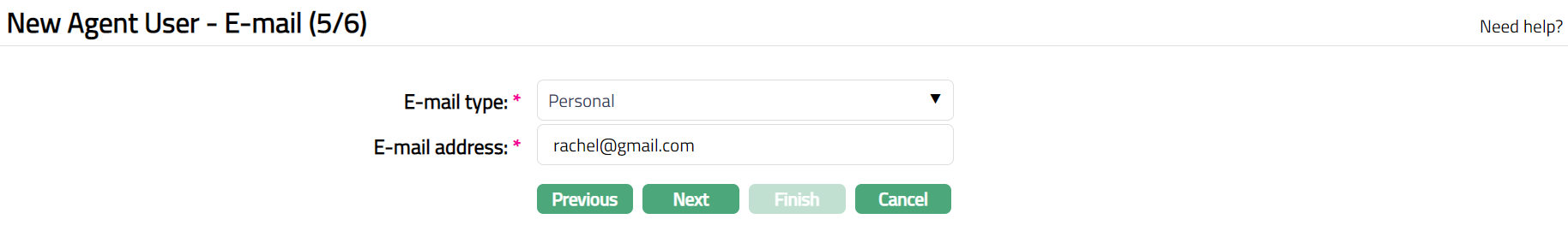 Click Next. New Agent User -- E-mail (5/6) page appears.