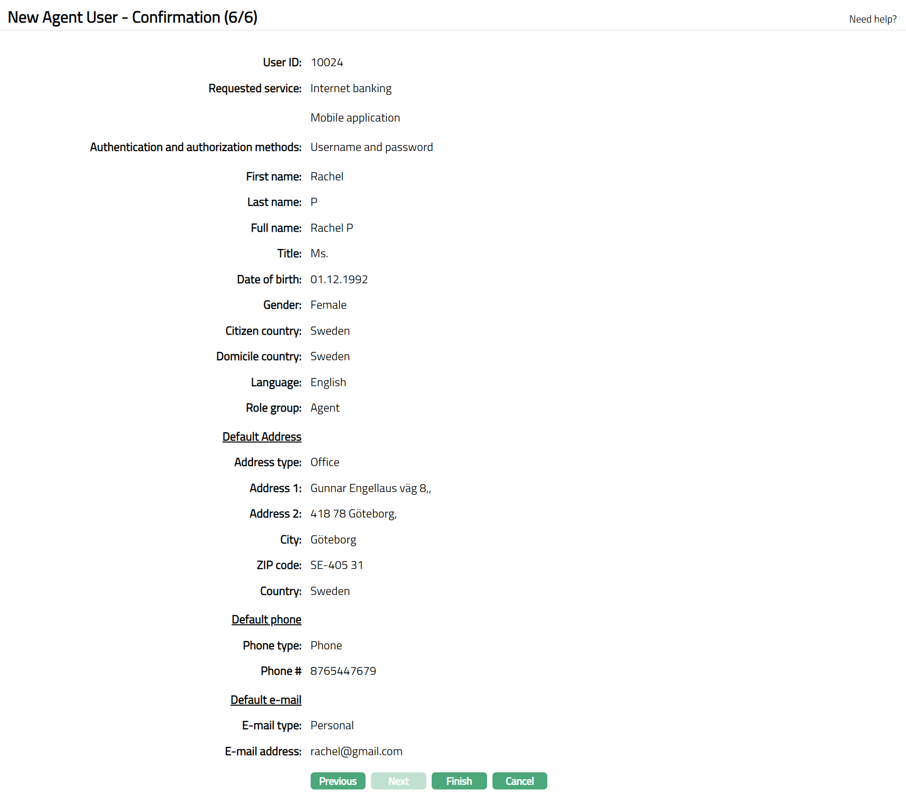 Click Next. New Agent User -- Confirmation (6/6) page appears.