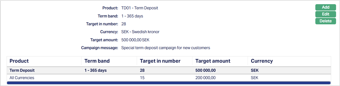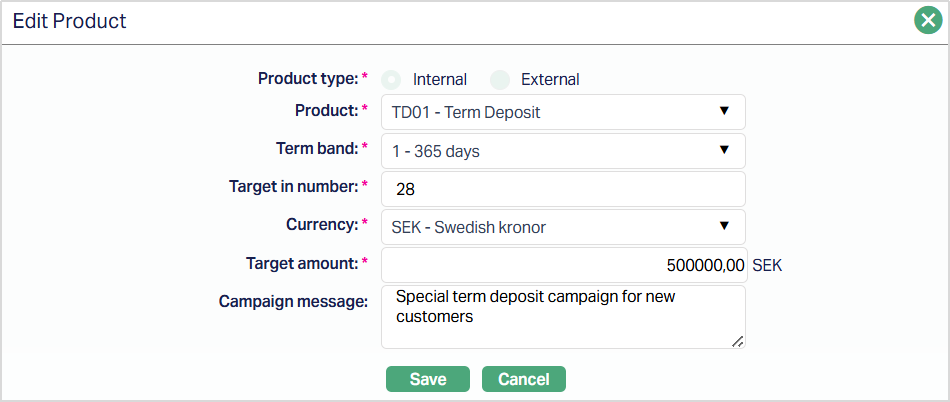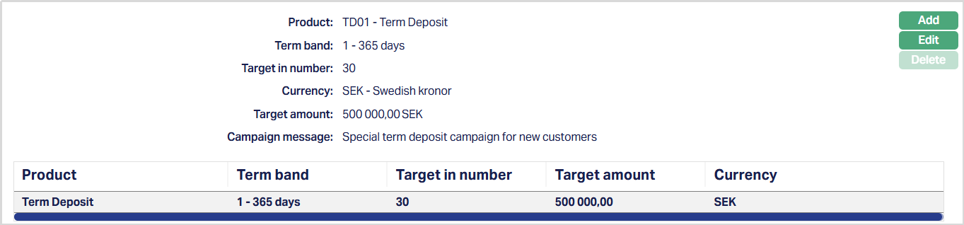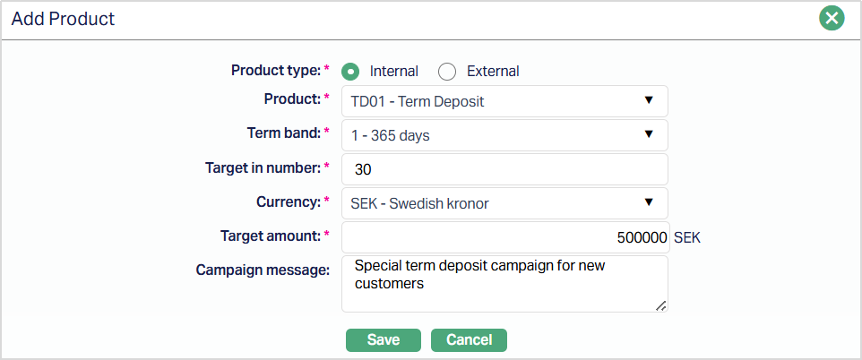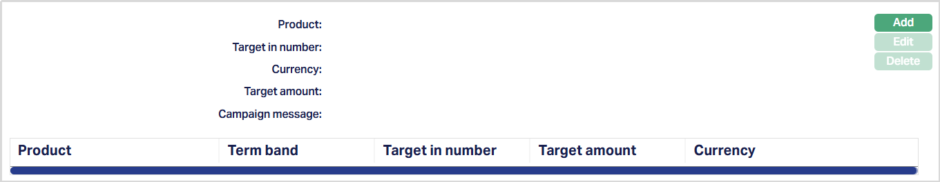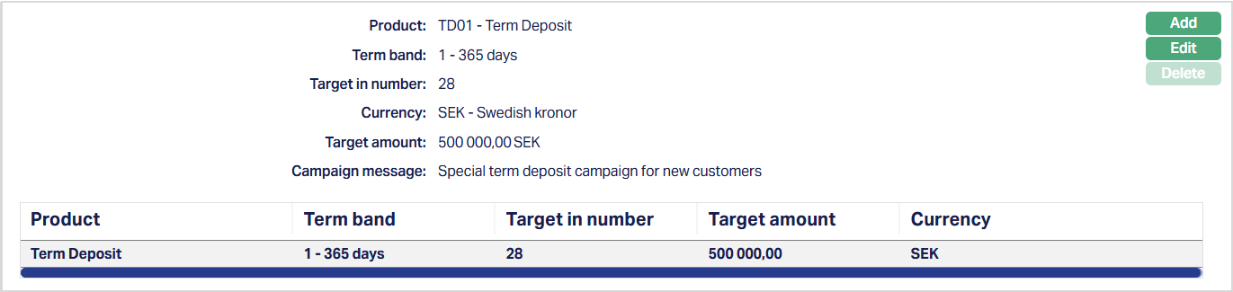Term Band selection is mandatoty for Term Deposit products. The Term Band drop-down is populated with all term bands maintained for the selected Term Deposit Product in the Product maintenance. You must select one Term Band for each campaign product entry. If the selected product is not a Term Deposit product, the Term Band field will not be displayed.