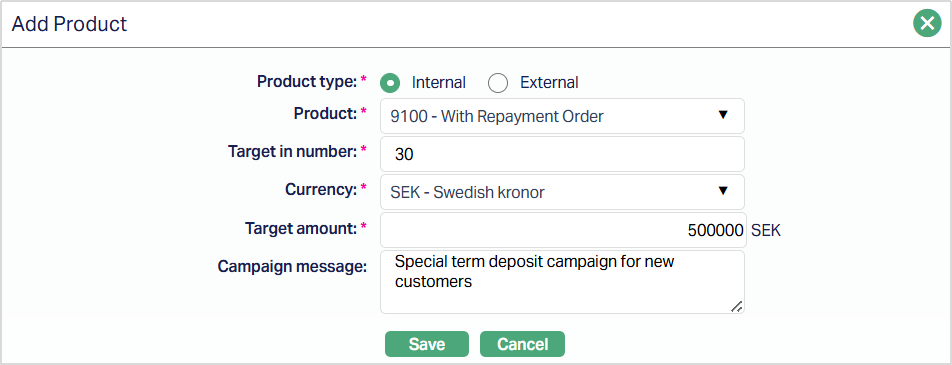Using this tab, you can attach internal or external products to the campaign and define campaign-specific targets.