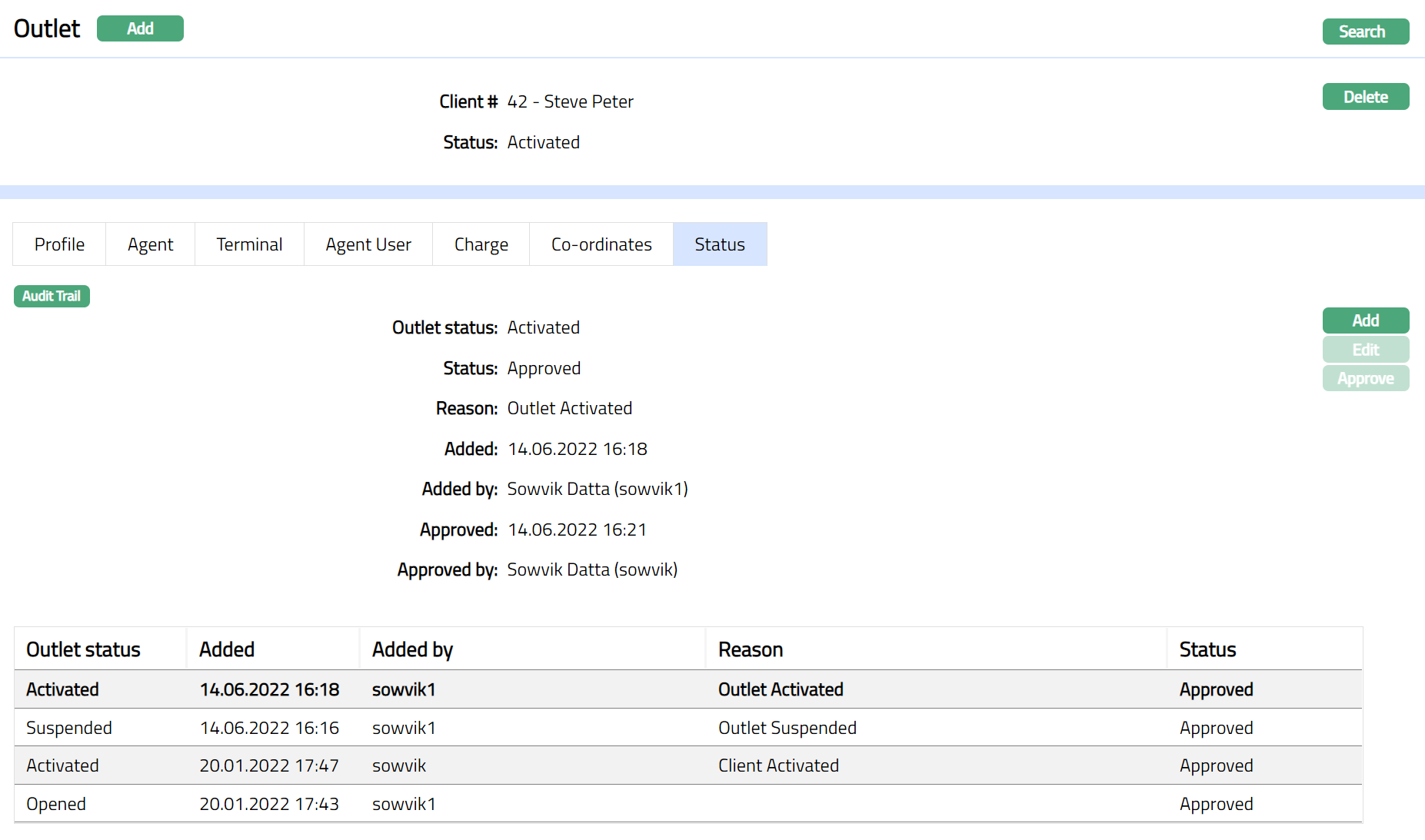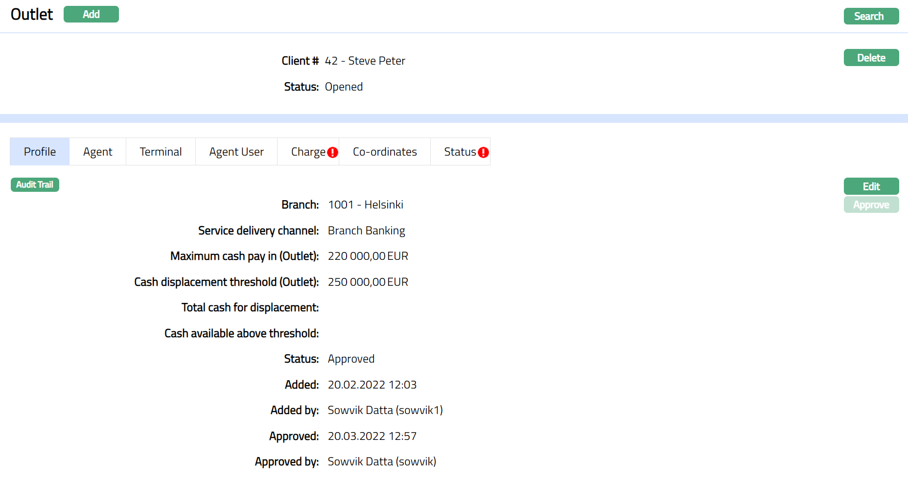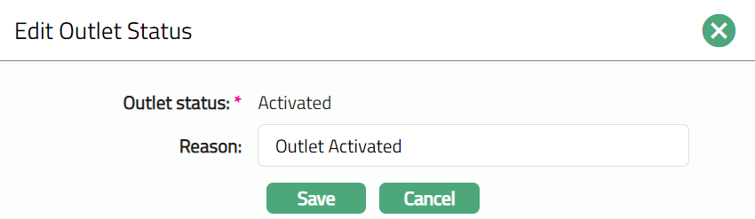 Note: On creation of an Outlet, the Outlet status by default will be Opened and Record status will be Approved. The Outlet will not be activated unless Activated status is added to the client and is approved by another user. Only on Approval by another user, the Outlet Status becomes Activated, record Status gets changed to Approved and the blue bubble disappears.
