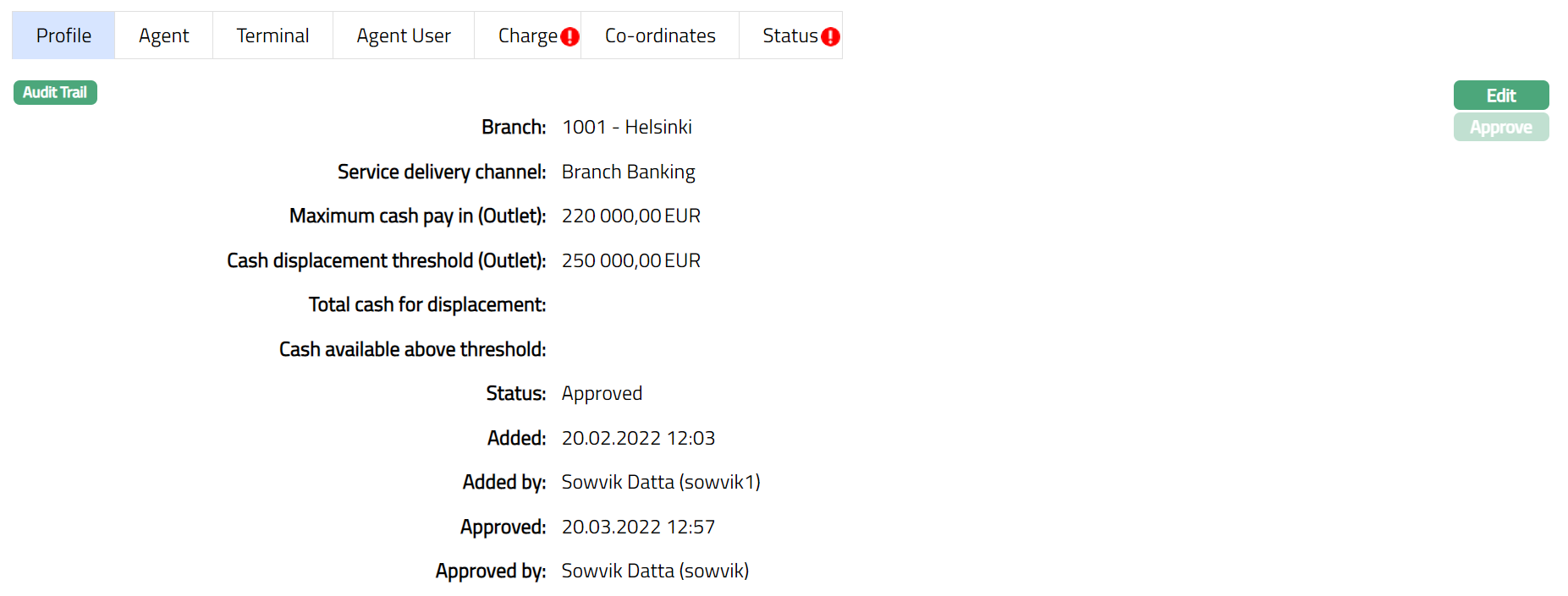 Note: Outlet status is Opened, and the record status is Pending. Unless the Outlet Maintain Status is Activated and record status is Approved, this Outlet will not be available for use elsewhere in Aura and a red bubble appears on the Profile tab. Once approved by another user / authorized person the red bubble disappears and the Status changed to Approved.