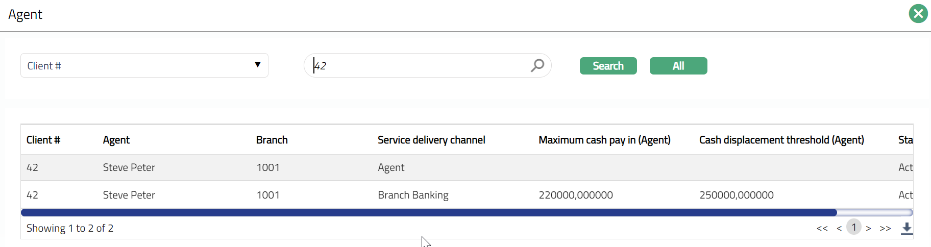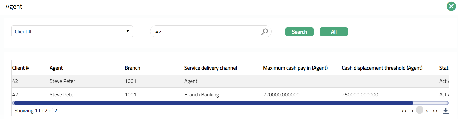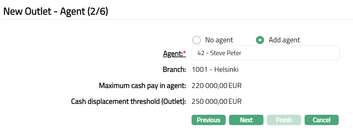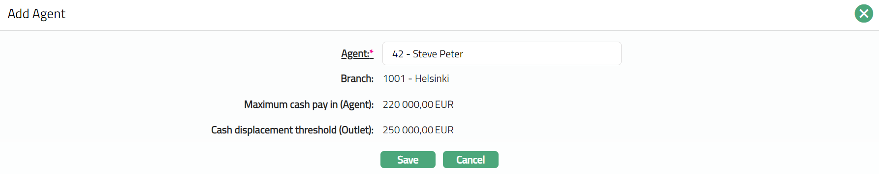 Maximum cash pay in (Agent) displays the maximum cash pay in limit maintained for the Agent.