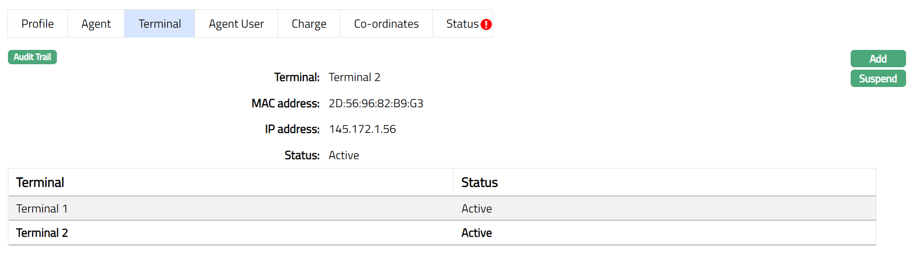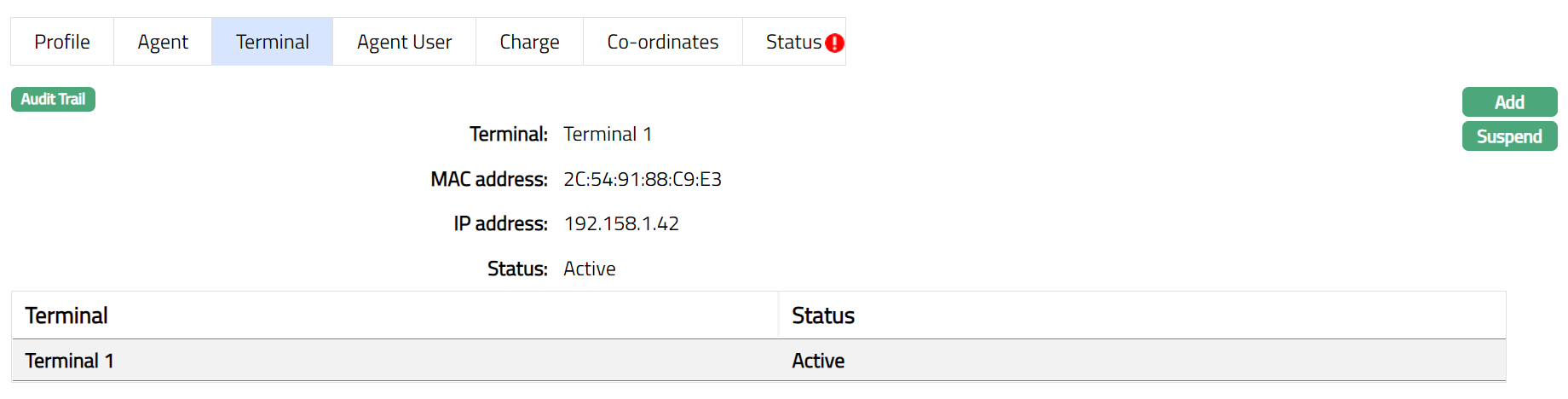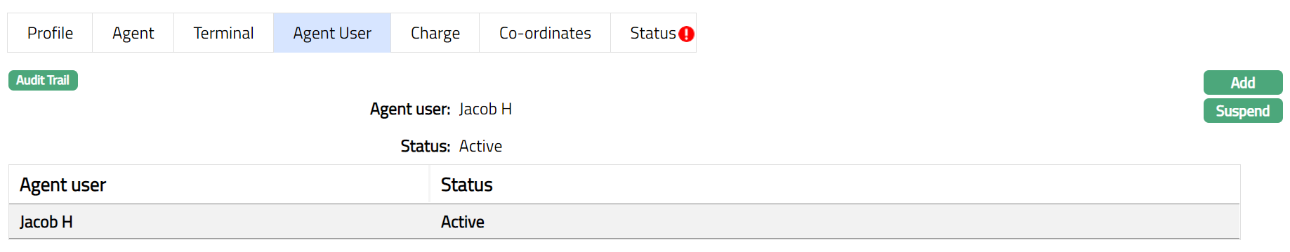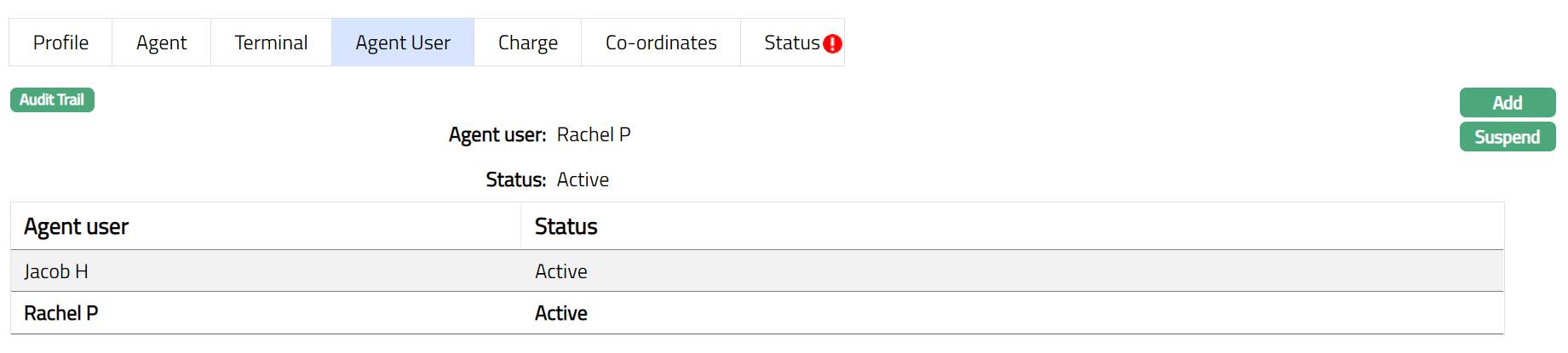 c. Suspended: If you want to suspend the Agent, then you can change the status of the record to suspend. On suspension of the Agent, Aura will suspend all Outlets, Terminals and Agent Users linked to the Agent. Aura will also suspend all Terminals and Agent Users linked to the Outlet, which is suspended at Agent Level.
