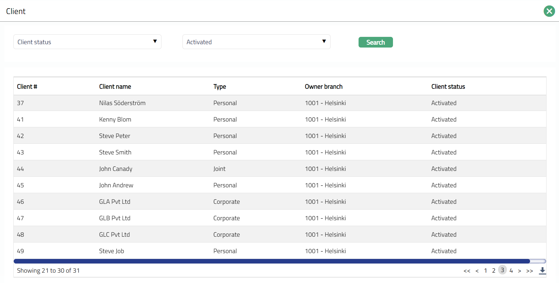 - Select Client# by clicking on client hyperlink. Client search page appears with the list of all types (Personal, Corporate and Joint) of clients; where you can search for a client with relevant criteria and select the required client. You can also input the client name and select the required client from the list displayed by Aura. Based on criteria, Aura will display the list of all the clients maintained under CRM > Client > Maintain.