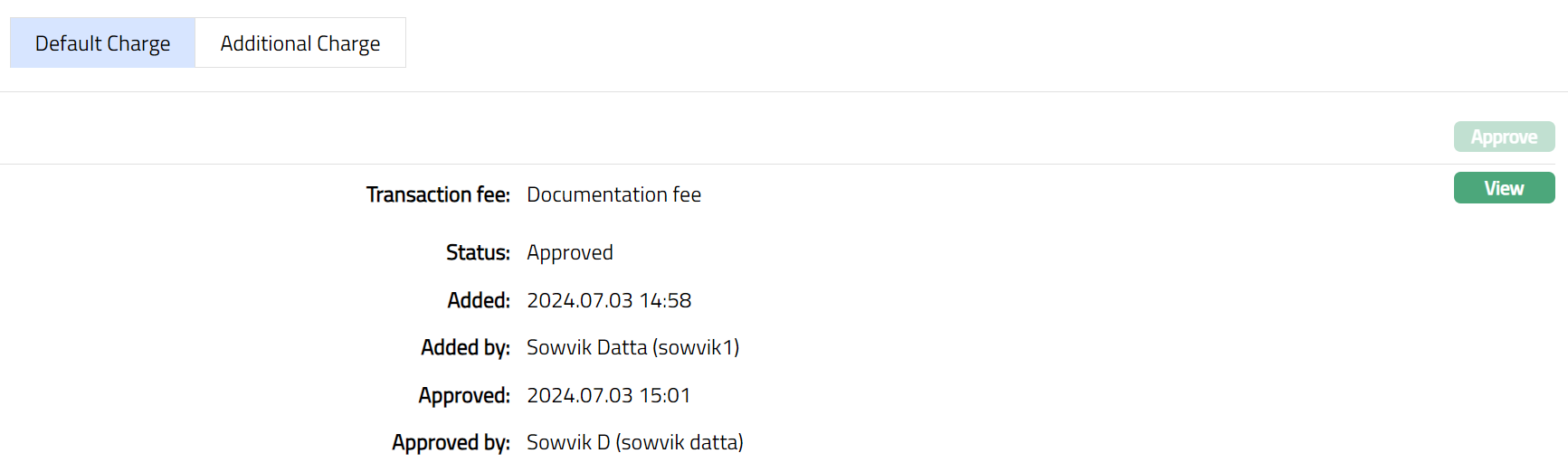 - Click View against each default charges to see the charge details and other parameters for the Charge. The details of the band of an attached charge Scheme is also displayed. The sample of the page is shown below.
