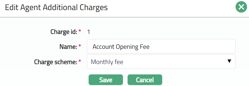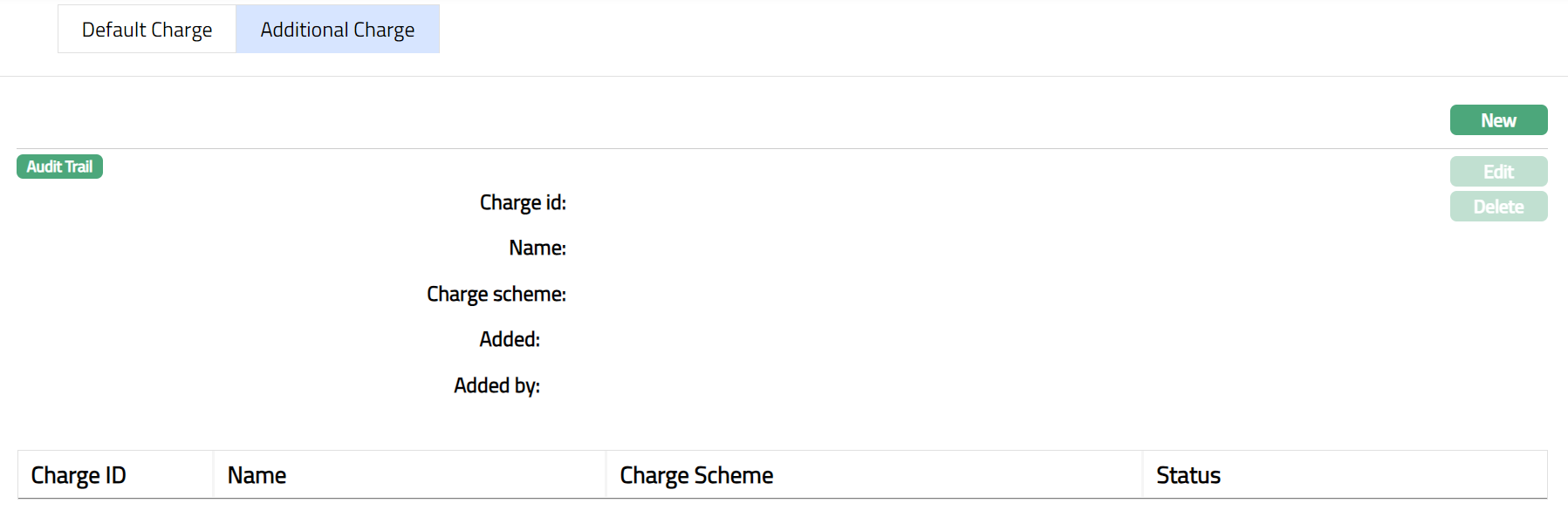 The Additional Charge tab allows you to add, view and maintain additional charges for the Agent. The charge ID will be generated in sequence for individual charge attached. If any charge is deleted, then the ID of the deleted charge will not be regenerated. Aura will allow you to add only periodic flat charges.