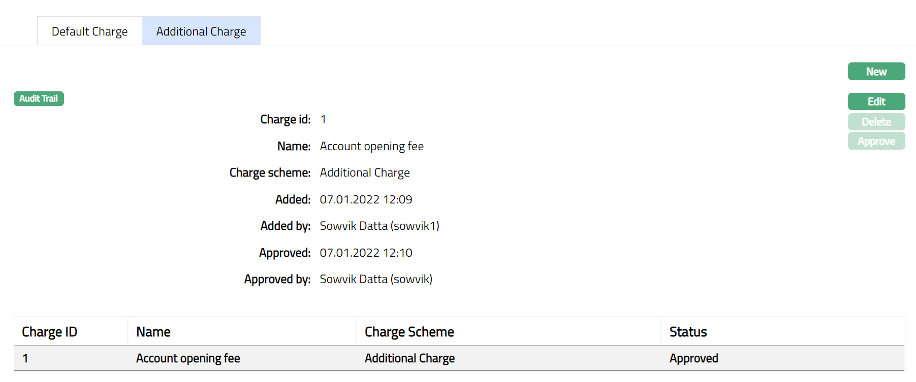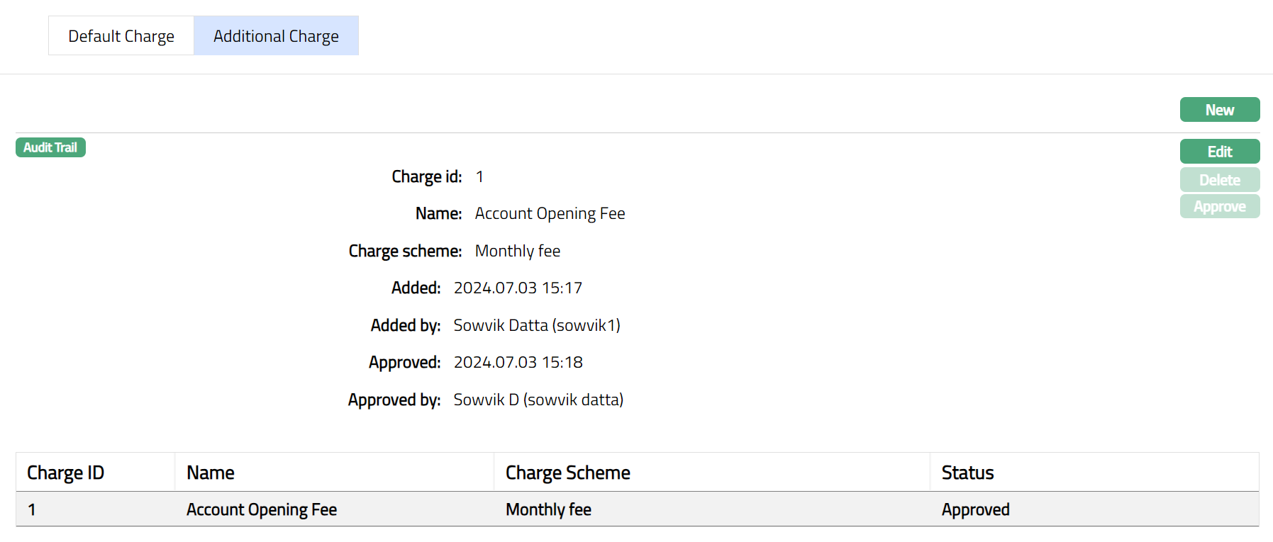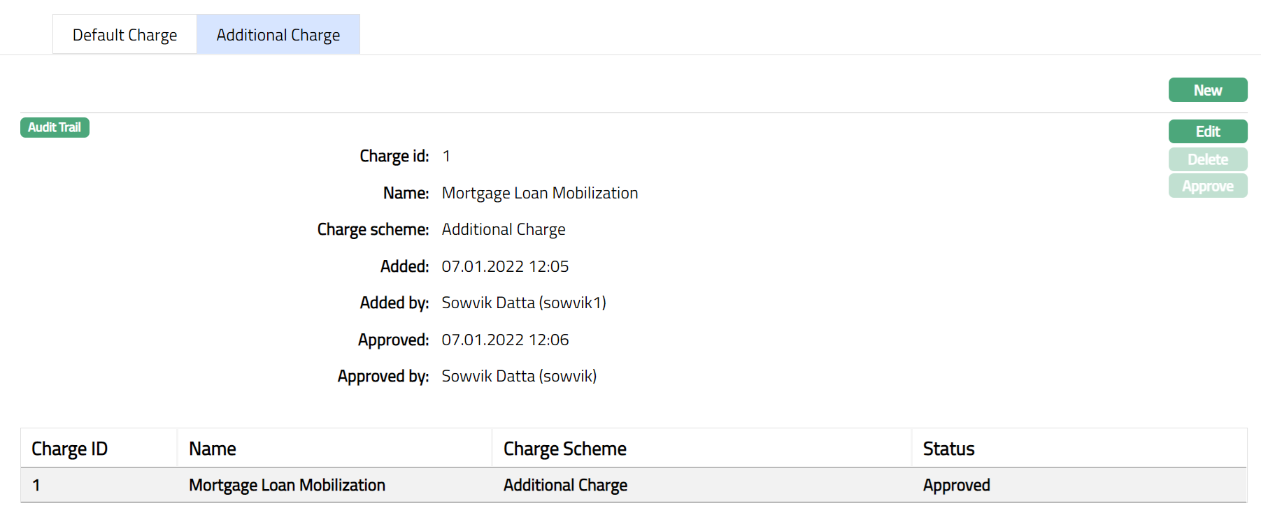 Functions: New, Edit, Delete, Approve