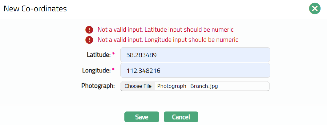 Enter the Longitude location of the branch. The Longitude range should be within 180 and -180. The number of decimals should not exceed 6 digits.