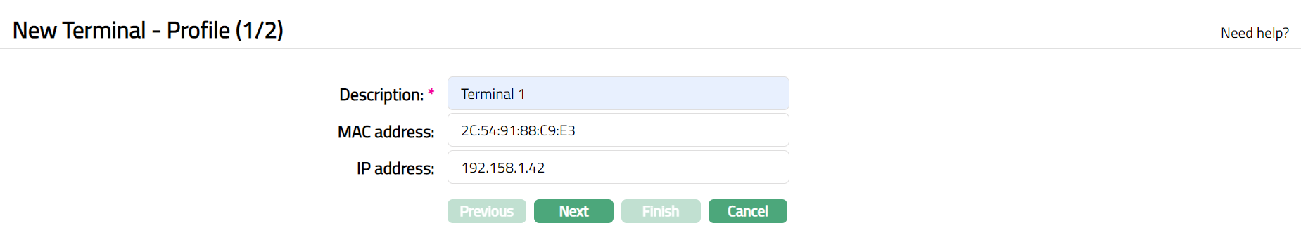 - From CRM menu, click Sales and then Terminal. New Terminal -- Profile (1/2) page appears.