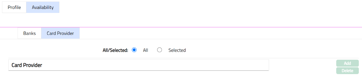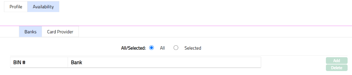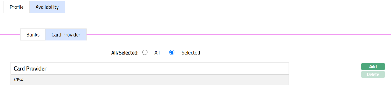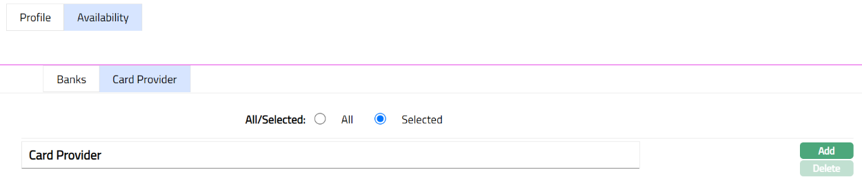 This tab can be used to control the availability of the Terminal of specific Banks and Card Provider. It has two Sub-tabs, one for each of these.