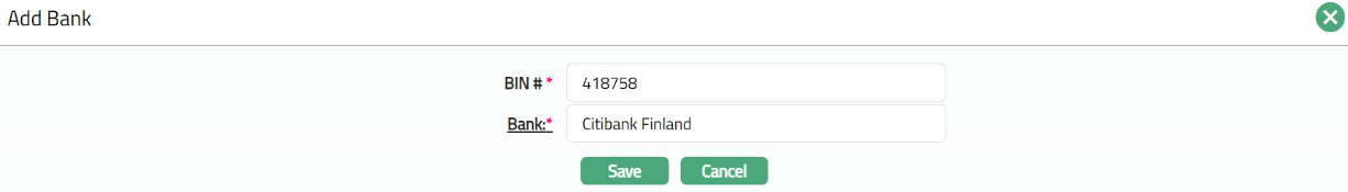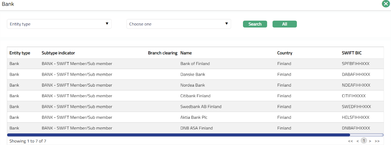 Click Bank hyperlink to select the bank. Bank page appears with the list of banks maintained under Admin > Correspondent Bank Management > Maintain.