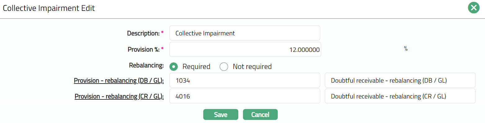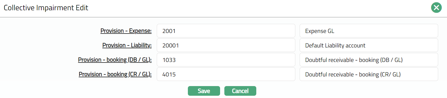 Using Collective Impairment functionality, you can maintain a certain percentage of outstanding loans or receivable amount as an allowance for probable loss in future.