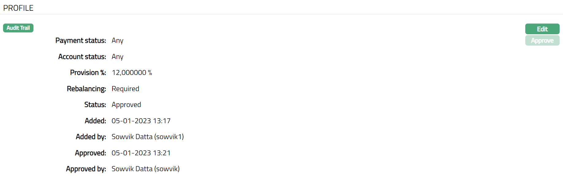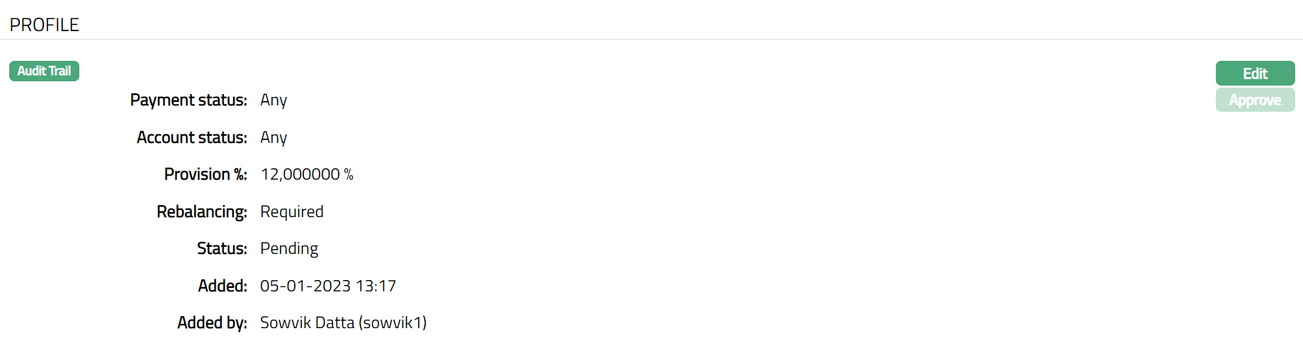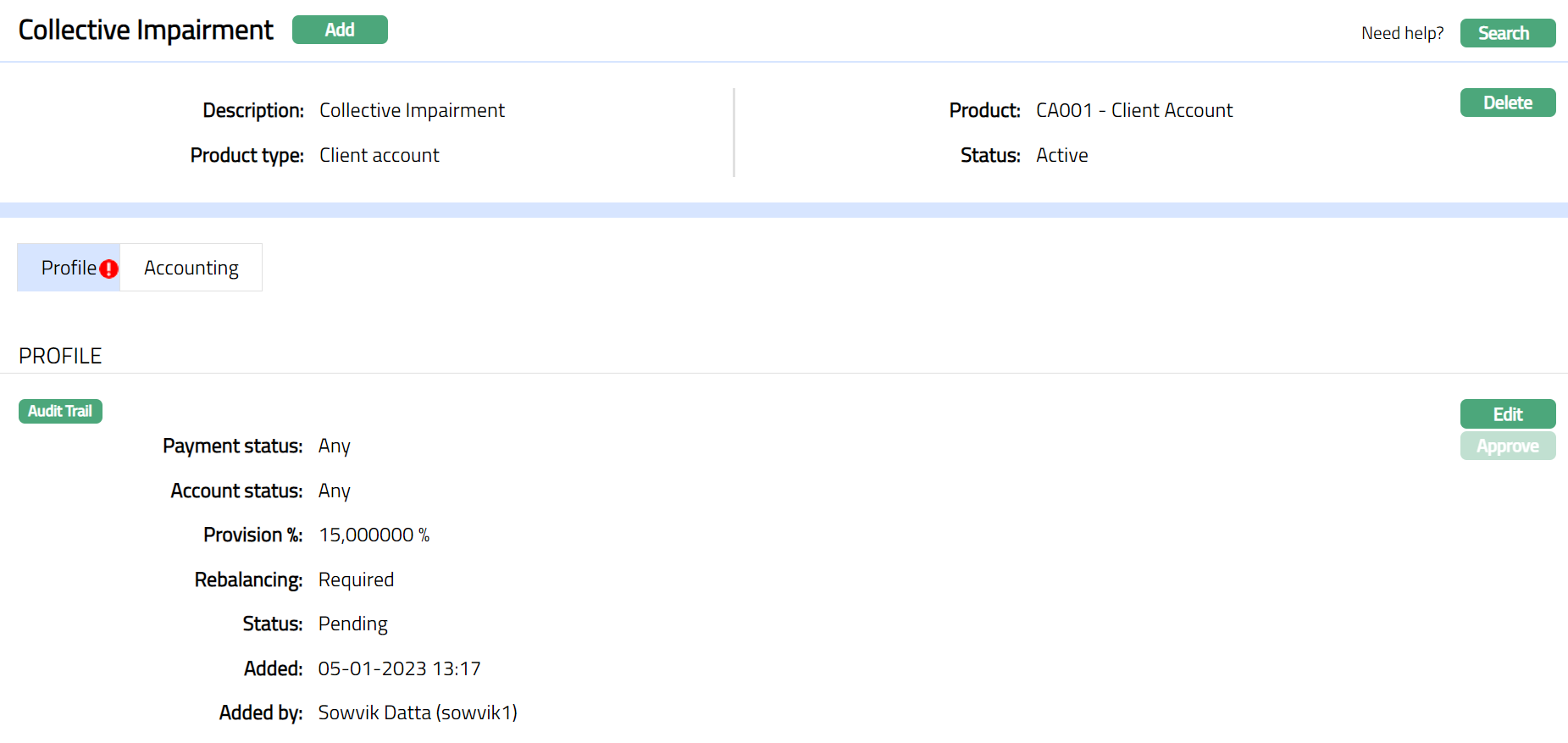 Profile tab, which is the default tab in the Collective Impairment Maintenance page shows the basic details of the Collective Impairment. The default status of the tab is Pending, and the status can be changed Approved. Any user other than the one who has created the record can approve the profile tab.
