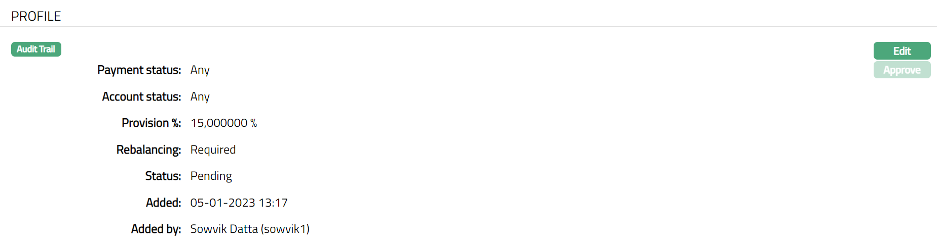 - Click Save. Profile page appears with the edited details with the Status appears as Pending until it is approved by another user who has not created the record.