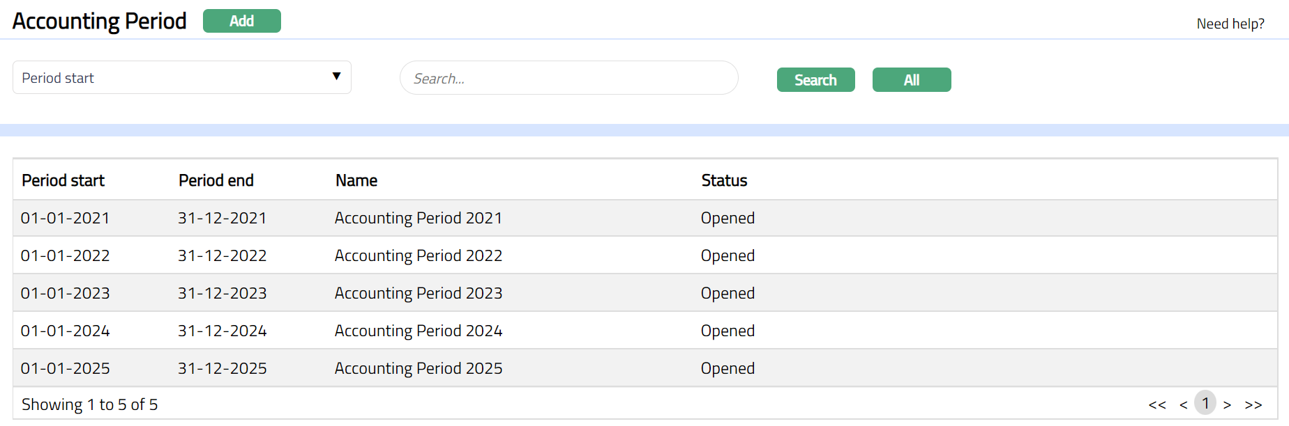- From General ledger menu, click Settings, and then Accounting period. Accounting Period Search page appears. All Accounting periods available in Aura appear on the page, sorted based on Period start.