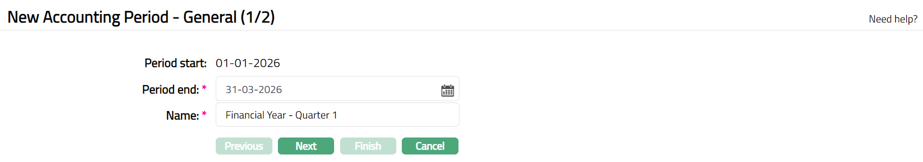 - Click Add. New Accounting Period -- General (1/2) page appears.