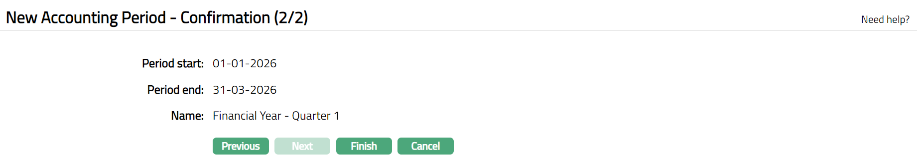 Click Next. New Accounting Period -- Confirmation (2/2) page appears.