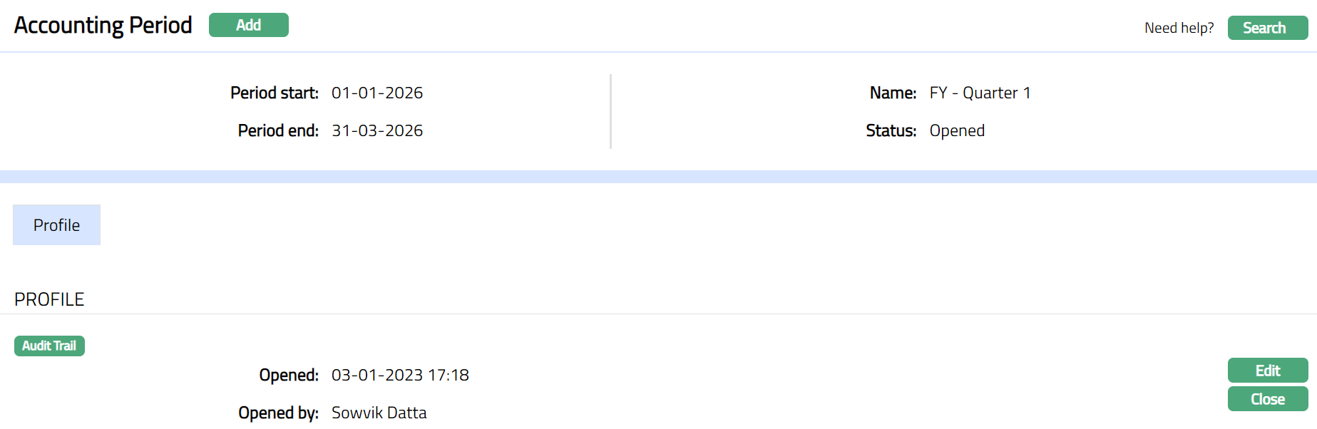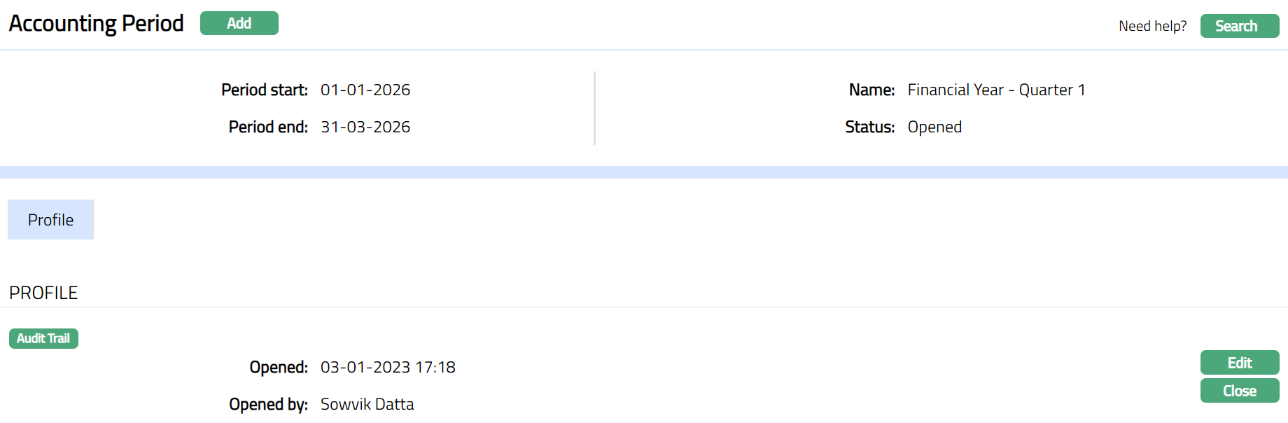 - Click Finish. Accounting Period page appears displaying the details of the Accounting Period you added.