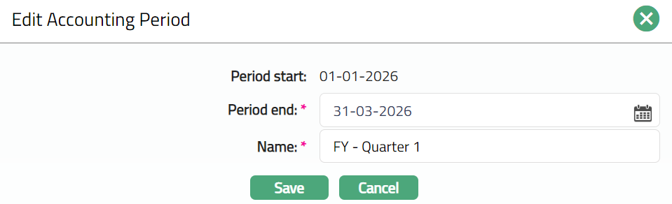 Period end and Name fields are editable. The date input in the Period end should not overlap with any other accounting period.