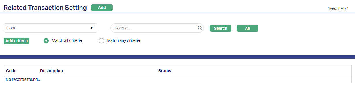Enter code to be assigned to the New Related Transaction Setting. It must be unique and serves as a reference key for future modifications or deletions.