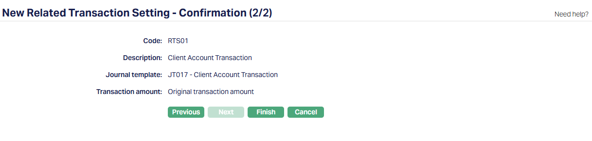- Click Next. New Related Transaction Setting -- Confirmation (2/2) page appears showing the details of all the inputs in the previous step.