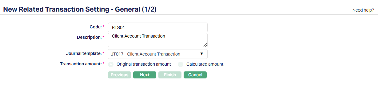 - Click Add. New Related Transaction Setting -- General (1/2) page will appear.