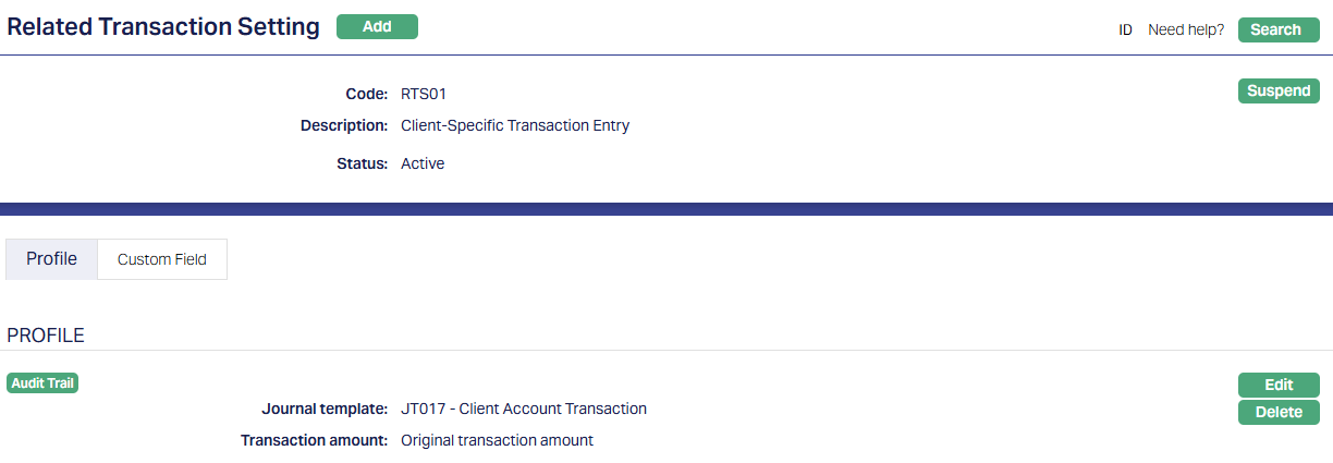 - Click Finish. Related Transaction Setting page appears displaying the Profile Tab. The Status is Active.