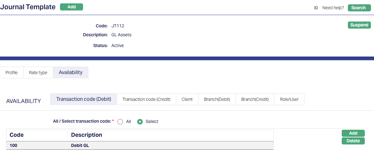 Select required GL account to be used for the journal entry when this transaction code is selected. The GL account should have been created using the GL Account Maintenance option.