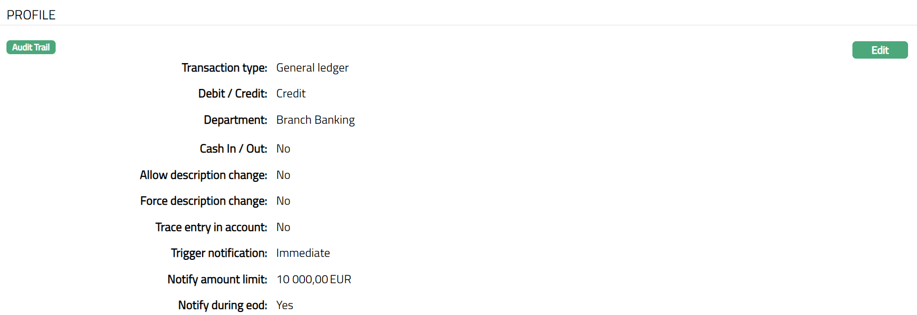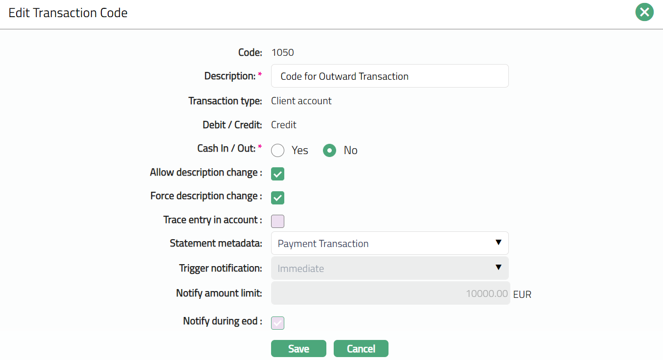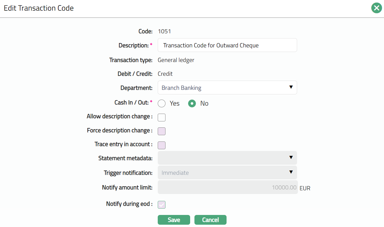Note: Except Code, Transaction type, Debit/Credit fields, rest all other fields are editable.