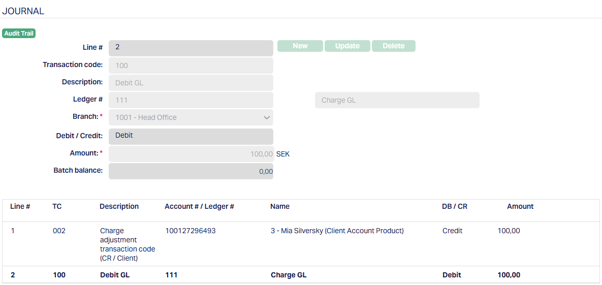 You can attach a charge to a transaction code such that the charge will be automatically calculated and posted in the same journal / batch whenever the Transaction code is used. For example, if there is a standard fee of SEK 10 for an outgoing wire transfer then the transaction code which is used to debit the client's account for the amount of the outgoing wire transfer can also automatically debit the same account for the transfer fee.